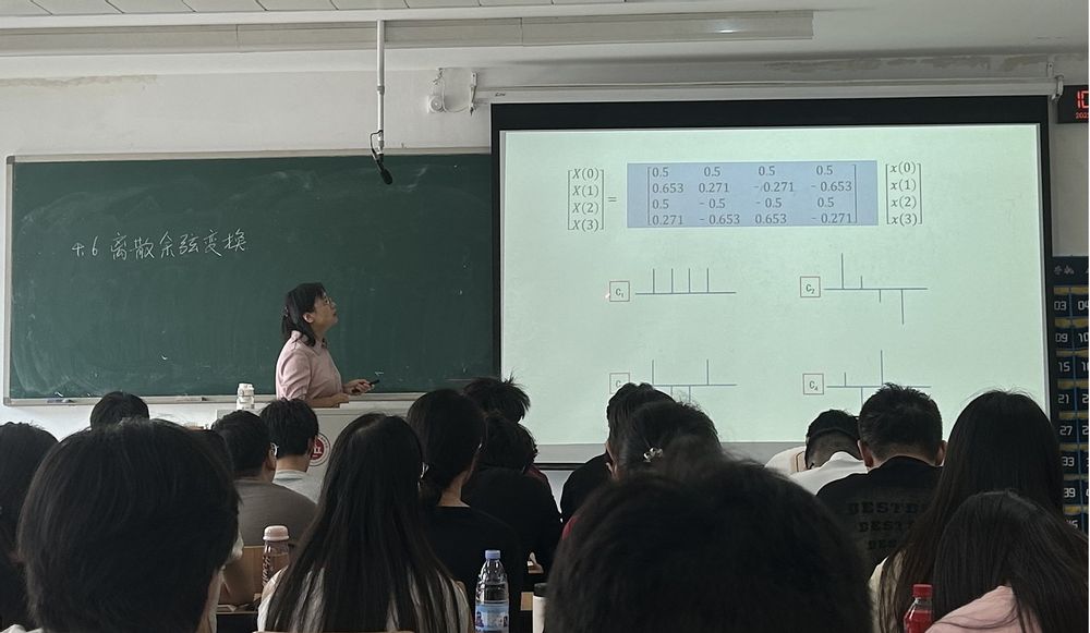 课程围绕“离散余弦变换的原理与应用”展开深入教学,姚老师以图像压缩技术为切入点,通过对比傅里叶变换与离散余弦变换的异同,引导学生理解DCT在数据压缩中的独特优势。在教学过程中,姚老师采用“问题导向+实例演示”的教学方法,从一维DCT公式推导入手,逐步延伸到二维DCT变换,通过4×4图像块的基图像分解,生动展示了频域变换的核心原理。