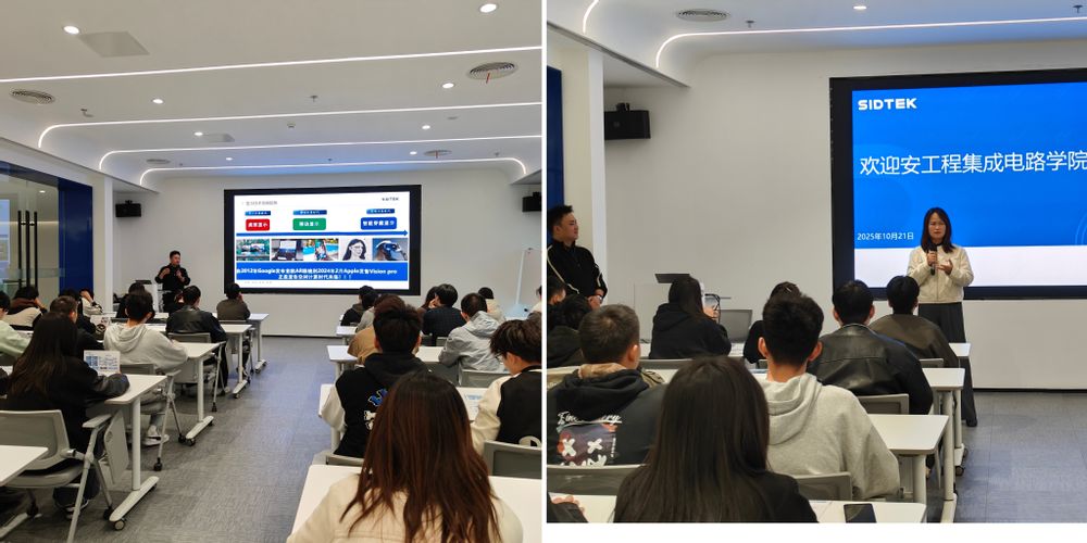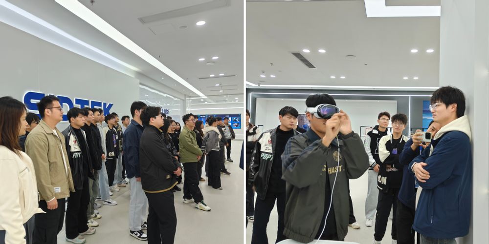 在熙泰现代化的科技展厅,师生一行深入了解了公司在Micro-OLED等微显示芯片领域的技术强项与产品布局,现场体验了多款搭载自研芯片的智能眼镜等终端设备,切身感受微显示技术在增强现实等场景的前沿应用,领略了“中国智造”的科技实力。师生还走进了净化车间,在外围走廊观摩芯片生产的核心环节。企业工程师现场讲解工艺流程与质量控制要点,使学生们对芯片从设计到流片、封装测试的全过程有了更具体的认识。