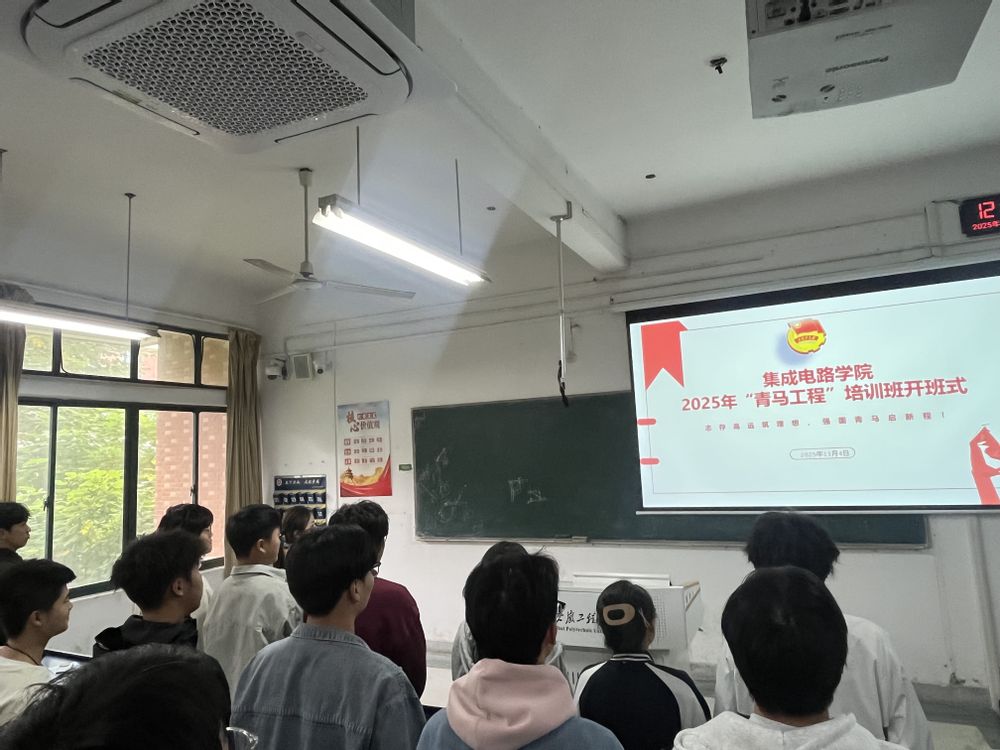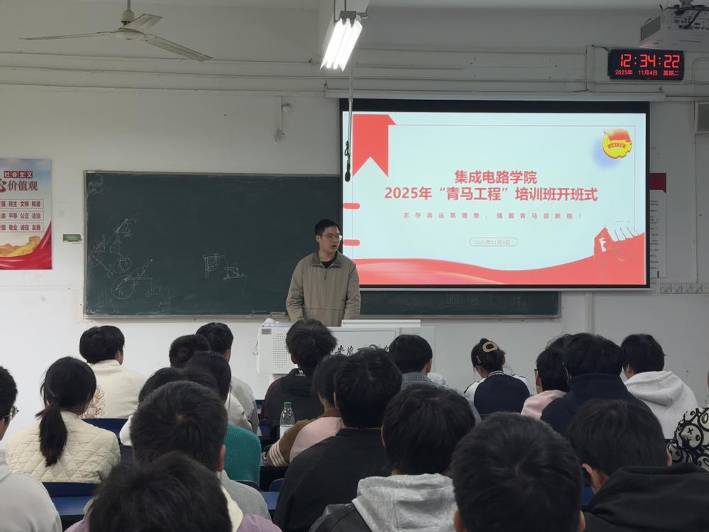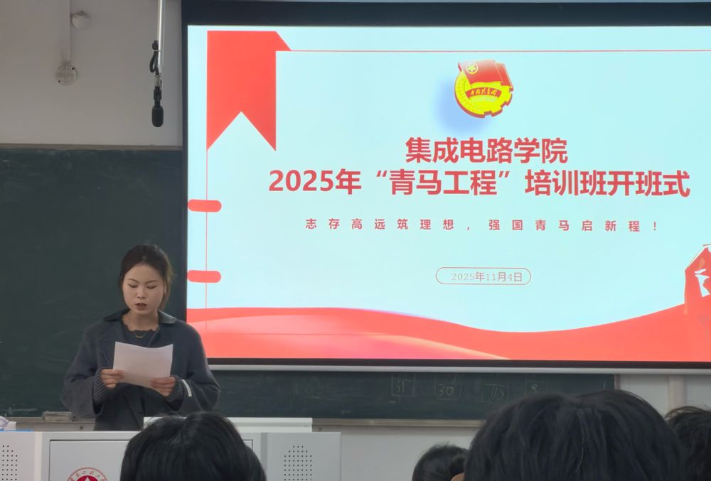 仪式在雄壮的国歌声中拉开帷幕。卢洁在开班致辞中代表学院团委对参训学员表示欢迎。他指出,“青马工程”是共青团为党培养青年政治骨干的重要平台,旨在锻造信仰坚定、能力突出、素质优良、作风过硬的青年马克思主义者。他强调,“青马人”不仅代表身份,更意味责任,希望全体学员坚定理想信念,做马克思主义的忠实践行者;练就过硬本领,成为知行合一的模范带头者;勇担时代重任,积极投身集成电路关键领域的创新突破。
