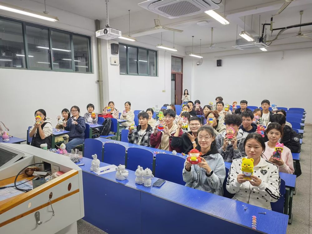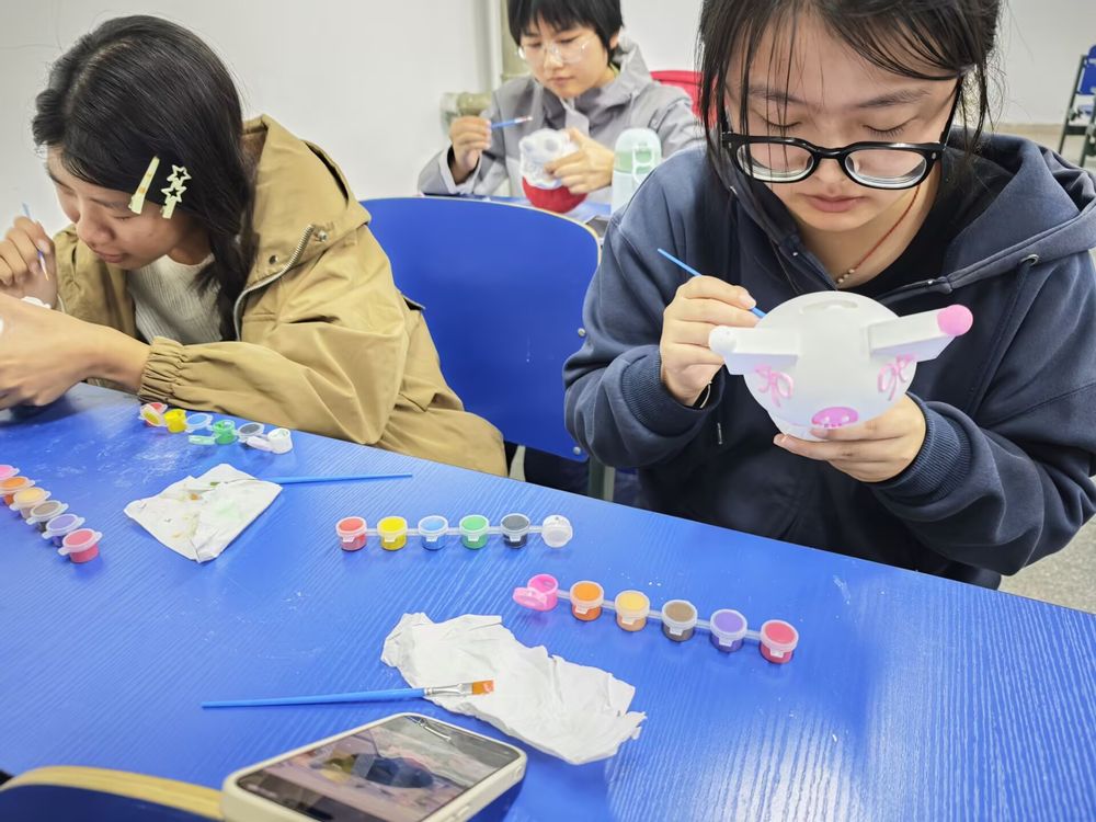 原本洁白朴素的石膏胚体,在同学们的巧手下逐渐变得鲜活灵动:呆萌的兔子带着手绘腮红,酷飒的机器人点缀荧光色块,每一件作品都彰显着大学生的独特想象力。创作过程中,同学们相互交流技巧、分享灵感,教室中不时响起欢声笑语,氛围轻松而热烈。