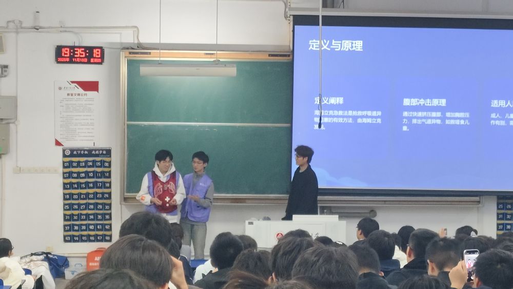 为强化校园应急防护体系,提升大学生自救互救能力,11月13日晚,集成电路学院一站式学生社区“芯”青年之家应急救护工作室志愿服务团队,走进校本部为25级自动化专业开展一场生动的“急救”班会。活动聚焦校园常见突发场景,以“专业演示+实操体验”的模式,助力同学们掌握实用急救技能。
