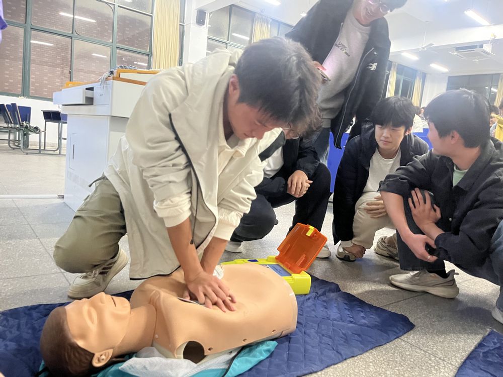本次培训秉持“实用、高效、易懂”原则,精准开展核心技能教学。工作室志愿者先结合校园内气道异物梗阻、意外晕厥等典型场景,用通俗语言讲解海姆立克急救法、CPR(心肺复苏)及AED(自动体外除颤器)使用原理,着重强调“黄金急救时间”的重要性。在演示环节,培训人员通过标准示范、易错点提醒,拆解海姆立克急救法发力技巧、CPR按压深度与频率标准,以及AED开机、电极片粘贴等关键步骤。实操练习中,同学们热情高涨,分组进行CPR规范按压、海姆立克标准发力及AED模拟操作,在培训人员指导下互相纠错,巩固技能要领,应急处置能力得到有效提升。