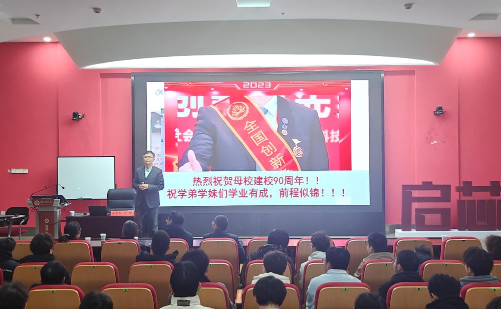 报告尾声,方明校友展示了自己在校期间参加“挑战杯”比赛的影像,坦言“每次领奖都佩戴母校校徽”,引发学子强烈共鸣,掌声经久不息。