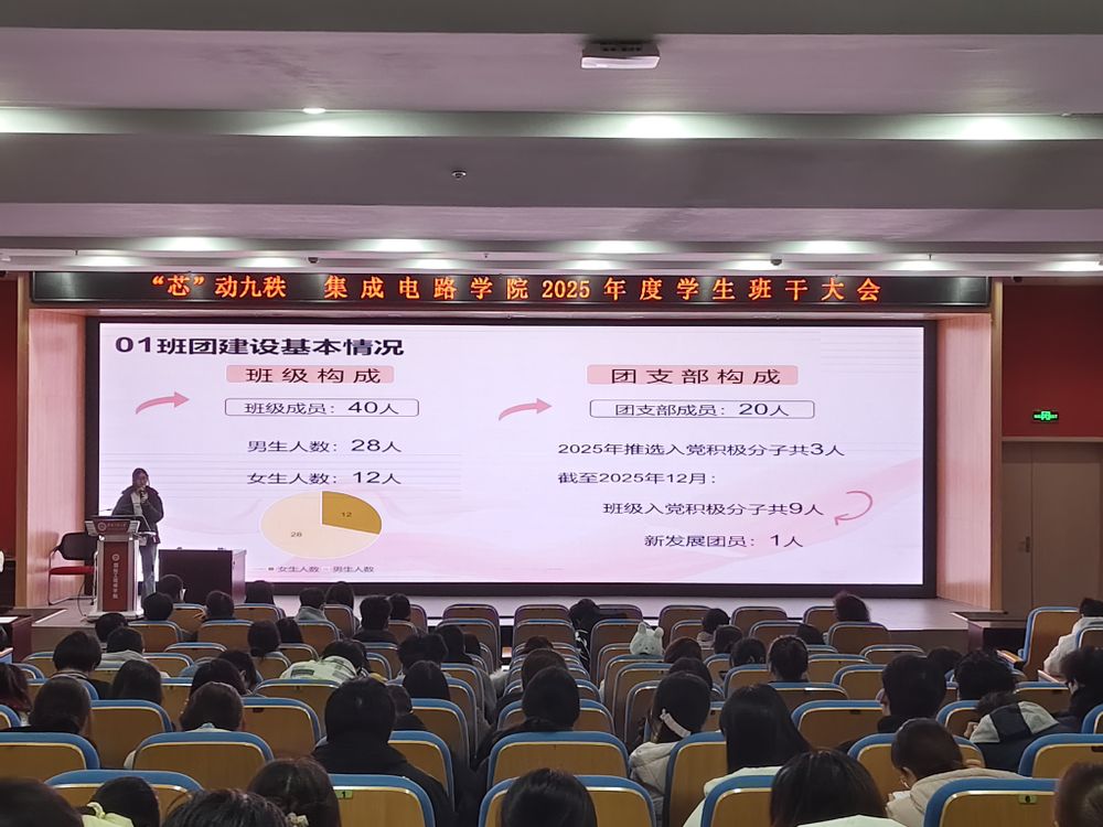 12月26日下午,集成电路学院2025年度班干大会在国际工程师学院赤铸报告厅举行。学院党委副书记苏燕南、23级和24级辅导员及全体班级学生干部参会。