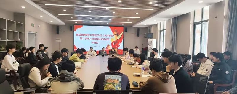 4月2日,集成电路学院分党校2025-2026学年第二学期入党积极分子培训班开班式在308会议室举行。学院党委书记杨会成、党委副书记苏燕南出席,班主任龙银银主持,130名学员参加。